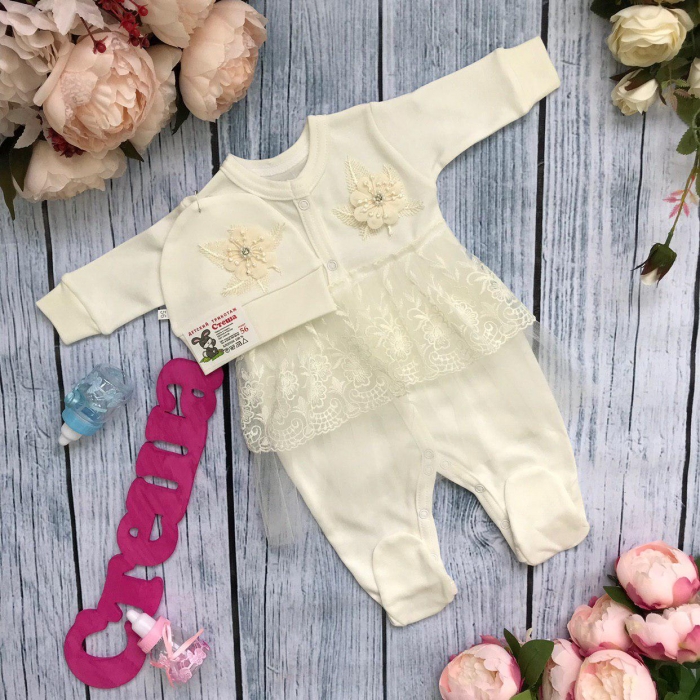 Комплект из 2 предметов, комбинезон "2-ная юбка" + шапка, украшен нежным кружевом